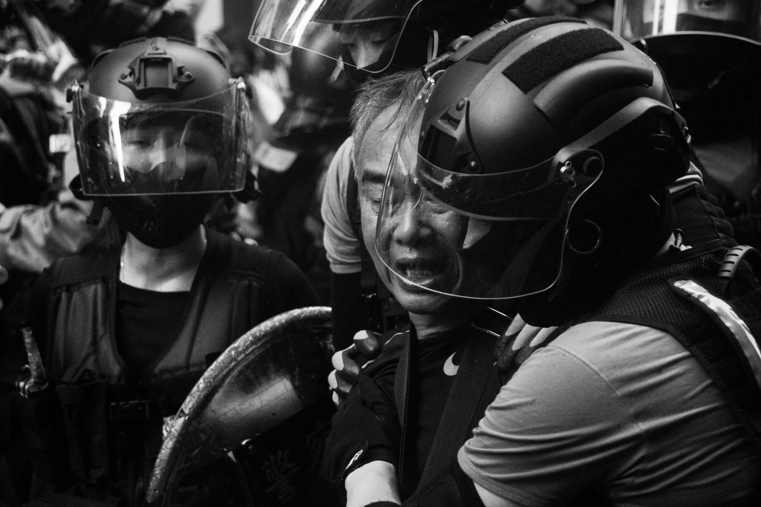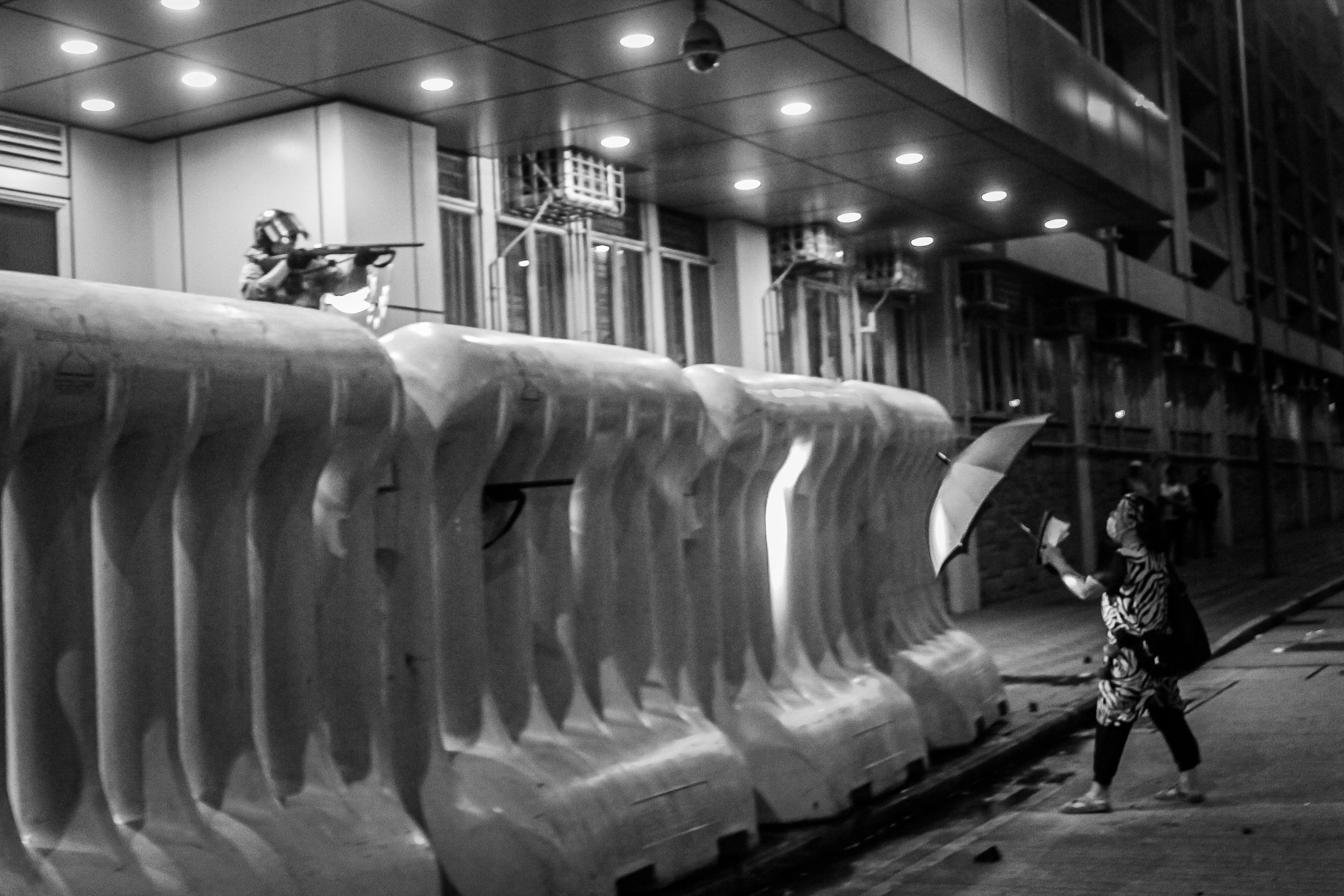 Holding an umbrella, a woman attempts to prevent a police officer shooting rubber bullets into a crowd in Mongkok, Hong Kong.