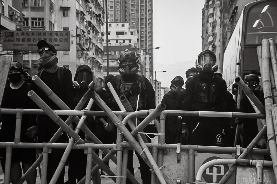 Black-clad protesters create makeshift barricade during protests in 2019.