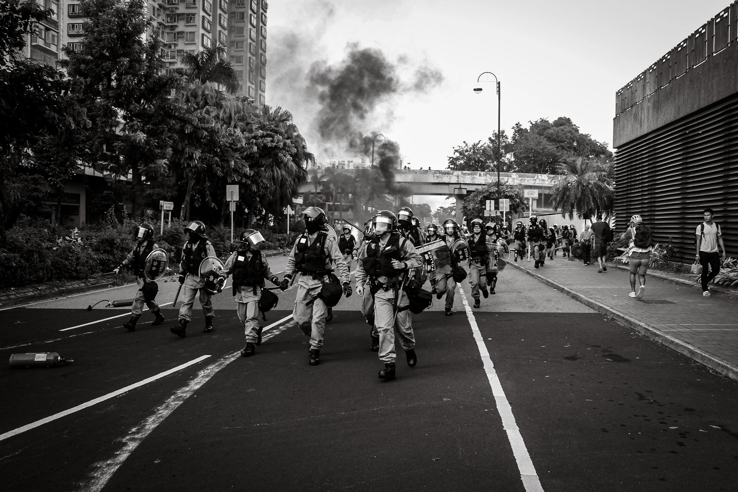 Hong Kong police charging towards a protest in Shatin as a fire breaks out behind them.